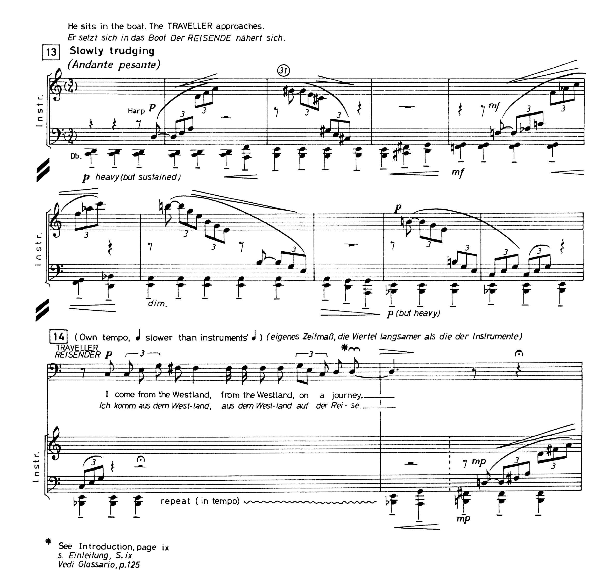 ここに旅人が登場する。「末も東の旅衣……」が、ここでは「私は西から北へと向かう、辛い旅を重ねた 旅人」(CR. 14)と言いかえられる。北へ向かうという点に注意したい。旅人はキリスト教世界から北の蛮 族の地へと向かうのである。しかし、旅の目的は明示されない。同じフレーズを一部省略して合唱が繰り 返す(CR. 15)【3】。旅人はさらに、野を越え山を越えする辛い長い旅を歌う。能の「雲霞、跡遠山に越 えなして……」である【4】(CR. 16)。かくしてCurlew Riverの辺にたどり着くと、旅人はそこに渡し舟 を見出す【5】(CR. 17)。再び合唱が歌う「川の歌A」をバックに、旅人は渡し守に舟に乗せてくれと請う 【6】(CR. 19)。渡し守は乗船を促すとともに【7】、かなたの物音のことを旅人に尋ねる【8】(CR. 20)。 能ではこれに対する旅人の答えの後で初めて登場する狂女が、オペラではここですでに舞台裏からの声 として登場している。旅人は、Black Mountainから来た狂女を人々が見物しているのだと答える【9】 (CR. 21)。